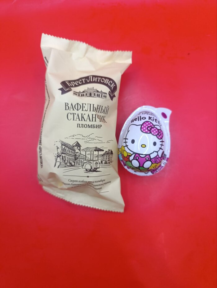 Не знаю почему так люди накинулись на пломбир на палочке от "Брест Литовск", потому что мороженое в стаканчике очень годное. А вместо шоколадного яйца с феями Винкс (где в отзывах ругали качество игрушек), мне положили Hello Kitty. В одной части яйца жирный и невкусный шоколадный крем двух цветов и печеньки, а во второй Kitty переодетая в обезьяну.