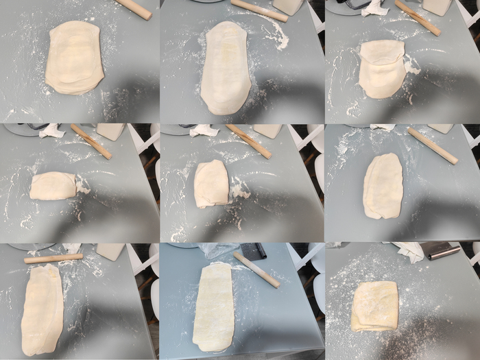 И начал раскатывать. Методика такая - конверт раскатываем в пропорциях 1 к 3, чтобы потом свернуть один край, накрыть его другим краем перевернуть на 90 градусов получившийся пирог и повторить. Маргарин полез после первого переворота, на фото видно уже при первой раскатке он как-то подозрительно просвечивает сквозь тесто. После второй раскатки я отправил тесто в холодильник на 15 минут и далее делал это через каждую раскатку. Полез он не с боков, а сквозь тесто и приходилось постоянно подсыпать муку, чтобы раскатать пласт. Из за такого заворотов получилось на много меньше, так как дальше, как по мне, не было смысла его раскатывать. Я положил его в пакет и убрал в холодильник.