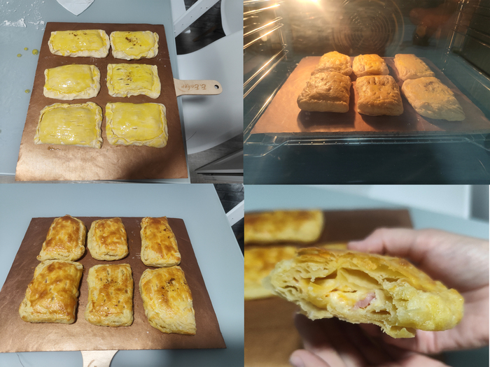 Настало утро, будем делать. Разделил тесто на 8 частей. Получилось сделать 3 слойки с ветчиной и сыром две с яблоком и две самсы с рубленой говядиной луком и жиром. поставил все на 25 минут, после вытащил все кроме самсы и оставил их еще на 5 минут доготавливаться. Тесто вроде поднялось, по слоистости примерно так же, как в предыдущем посте. По вкусу жене больше всего понравились с ветчиной и сыром, даже обидно за самсу стало, сказала тесто больше для ветчины и сыра подходит. На втором месте самса замыкают яблоки, считает что яблочную начинку неудачно приготовил.