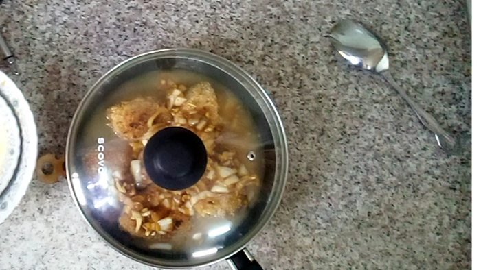 3.На хорошо разогретую сковороду наливаем масло и даем ему нагреться. Теперь кладем мясо и жарим до золотистого цвета на большом огне пока не выпариться жидкость и перестанет выделяться пена. Затем к мясу добавляем лук и жарим до золотистого цвета. Затем кладем морковь ,перемешиваем и тушим до мягкости 5-7 минут. Как только морковь станет мягкой ,добавляем соль ,специи и наливаем 200 мл воды, доводим до кипения и тушим без крышки 10-15 минут.