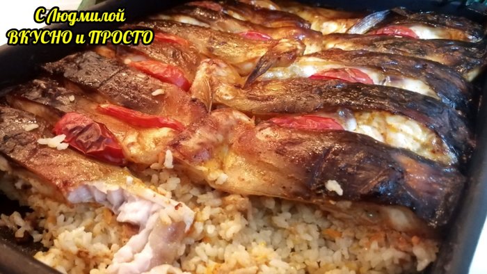 Теперь берем противень, я его просто смочила водой, выкладываем в него рис и разравниваем. На рис сверху вот так красиво, кожицей вверх выкладываем рыбу. Остатки маринада распределяем по рыбе. Между кусочками рыбы вставляю дольки помидоров. Они придадут сочности блюду и дополнительную кислинку.