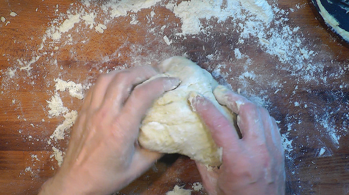 Из каждой части теста сформировать круглые булочки и хорошо прижать ладонью чтобы придать равномерно плоский вид. Прикрыть чуть влажным кухонным полотенцем и оставить на 30 минут.
