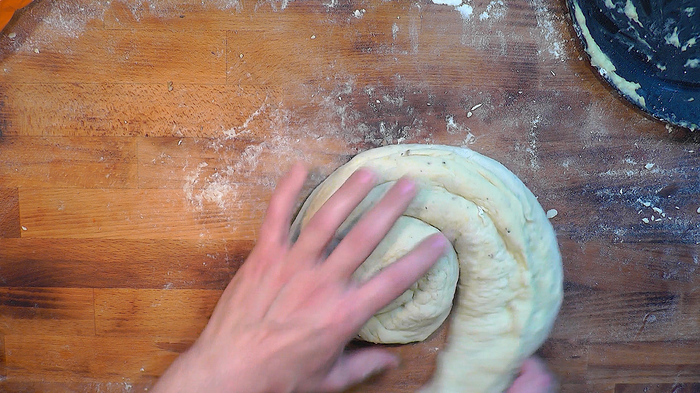 Когда тесто подошло, достать на щедро посыпанную манкой поверхность, обмять, разделить на 16 частей.
