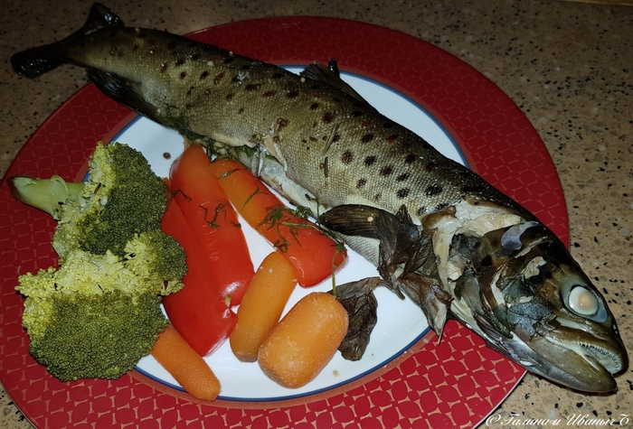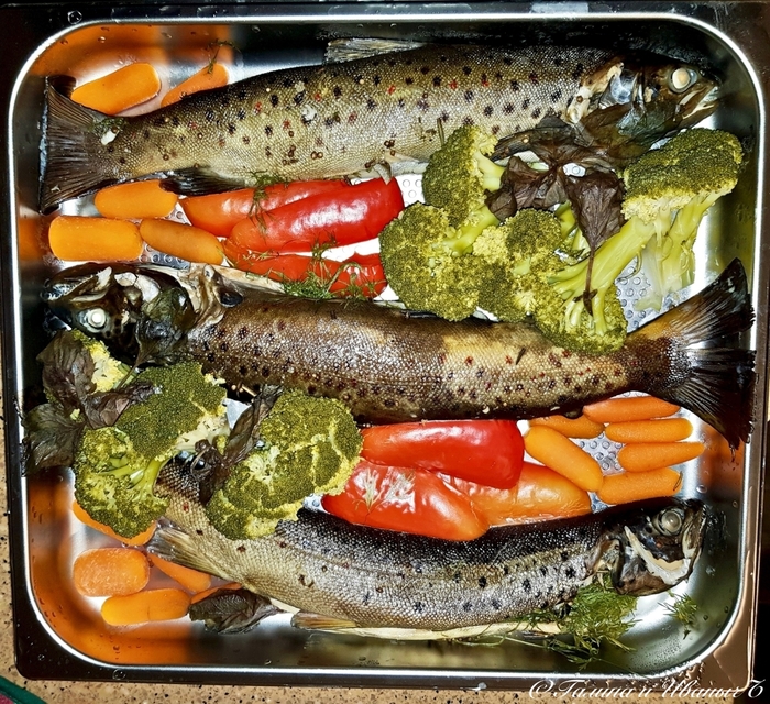 Рыба, ничего не скажу, получилась замечательно. В смысле приготовления. НО!!! Больше такую форель брать не будем – это точно. Сама по себе, имеется в виду, рыба совершенно невкусная. Как невкусно? А невкусно и все. Наверное – на любителя.