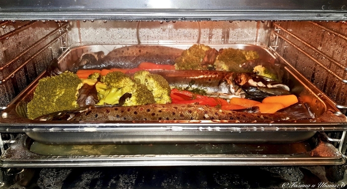 Инструкция утверждает, что достаточно минут 20 для рыбы. Может быть. Но это время не для армянской рыбы. Почти час форель парилась. Кстати, этого времени и для овощей вполне хватило, особенно морковке, да и капусте лишнего не вышло. Было опасение, что перец разварится - перепарится, ан нет – все получилось очень даже упруго и сочно.