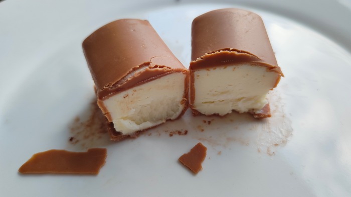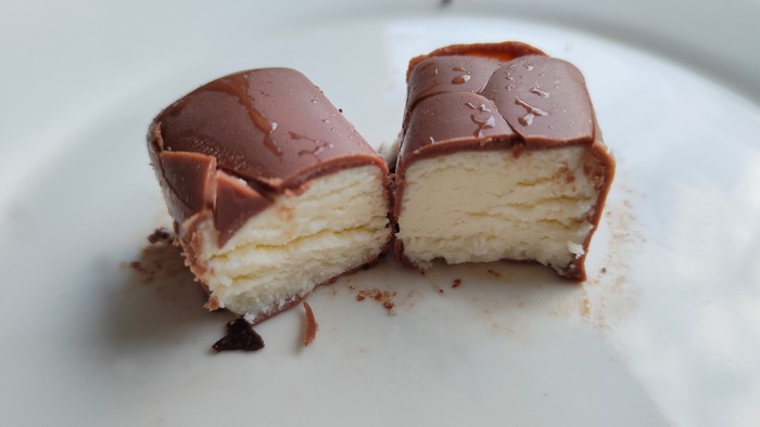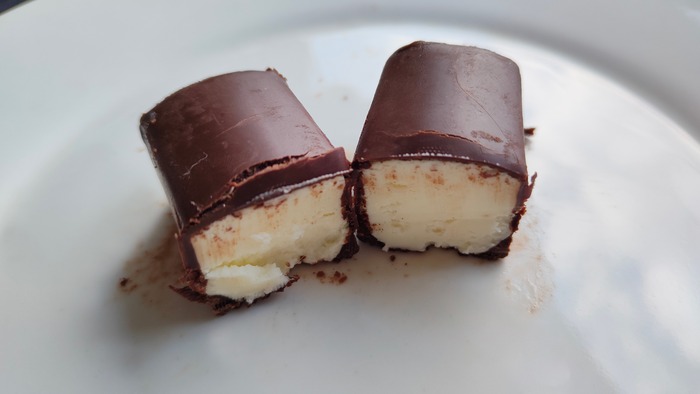 Вкусовые качества: Сырок сладкий, молочный шоколад ощущается. Внутренняя начинка сильно отличается от остальных сырков, потому что здесь консистенция частично напоминает очень нежное и взбитое безе из творога, или даже птичьего молока. Очень нежный и приятный по ощущениям сырок. Привкус ванили присутствует.