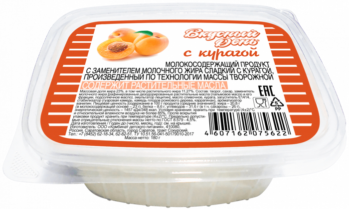 Состав: молокосодержащий продукт с заменителем молочного жира, произведенный по технологии творога (молоко цельное, молоко сухое обезжиренное, заменитель молочного жира (рафинированные дезодорированные растительные масла в натуральном и модифицированном виде, антиокислитель концентрат смеси токоферолов Е306), комплексная пищевая добавка (эмульгатор Е471, антиокислитель Е330), закваска на чистых культурах молочнокислых микроорганизмов), сахар, комплексная пищевая добавка: стабилизатор комплексный (эмульгатор Е1414, стабилизатор Е415, загуститель Е412), консервант Е202, растительный экстракт «Экстракт Ванили», глазурь кондитерская (сахар, заменитель масла какао лауринового типа, масло кокосовое рафинированное, какао-порошок, эмульгатор Е322, ароматизатор пищевой Ваниль.