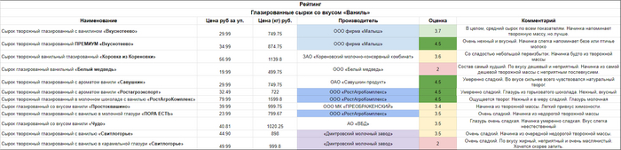 Наименование сырков я брал с задней части упаковок, где производитель указывает полное наименование своего продукта, а не рекламное с лицевой стороны.