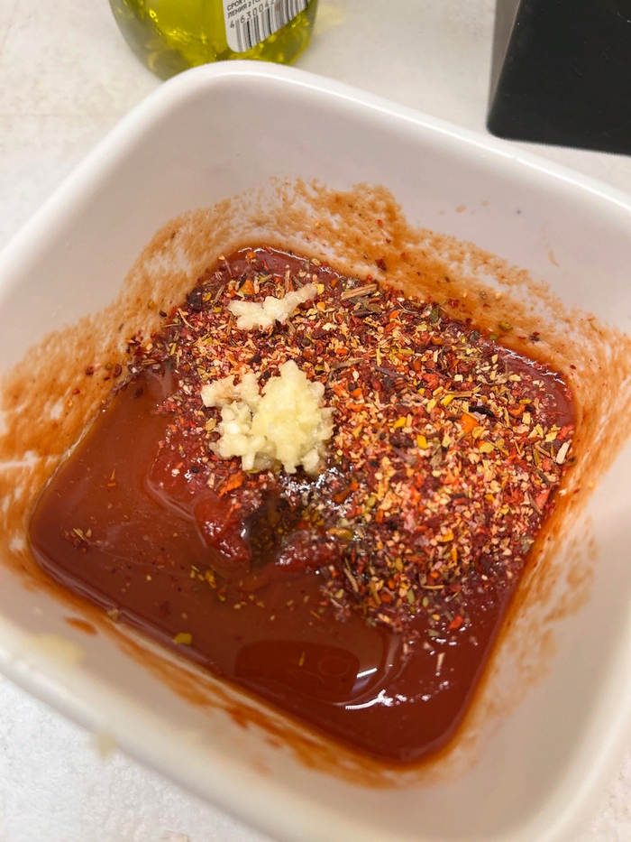 За это время подготовим маринад. В глубокой миске смешиваем 2 ч.л. копченой паприки, 3 ч.л гранулированного чеснока, 1ч.л молотого чили перца, 1 ч.л. сахара, 10 гр. нитритной соли и 1 ч.л обычной соли. Для получения приятных цитрусовых ноток раскатываем лимон по рабочей поверхности, чтобы он лучше отдавал сок, разрезаем его пополам и выдавливаем его сок в миску к приправам. Добавляем в маринад 100 мл. соевого соуса. Затем перемешиваем всё вместе до полного растворения соли и сахара.