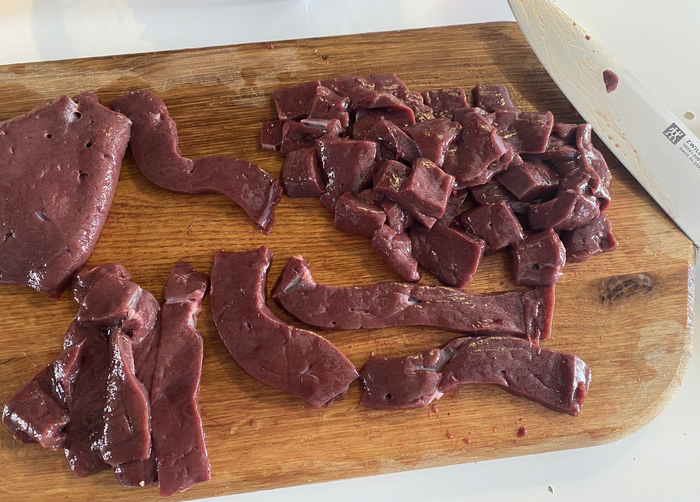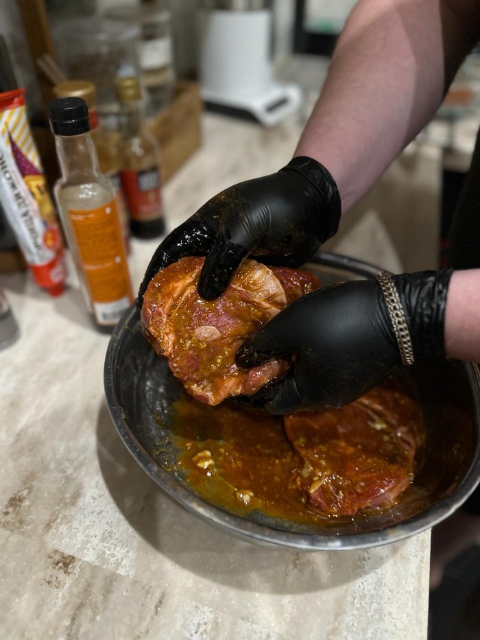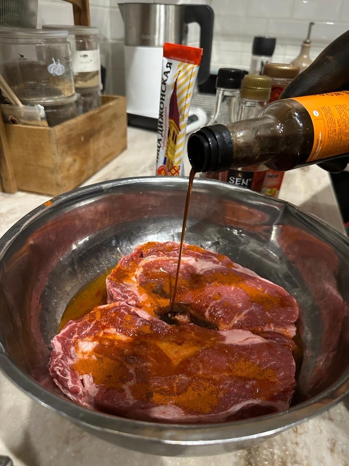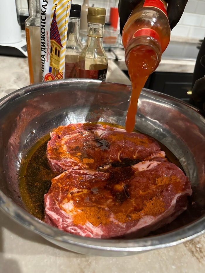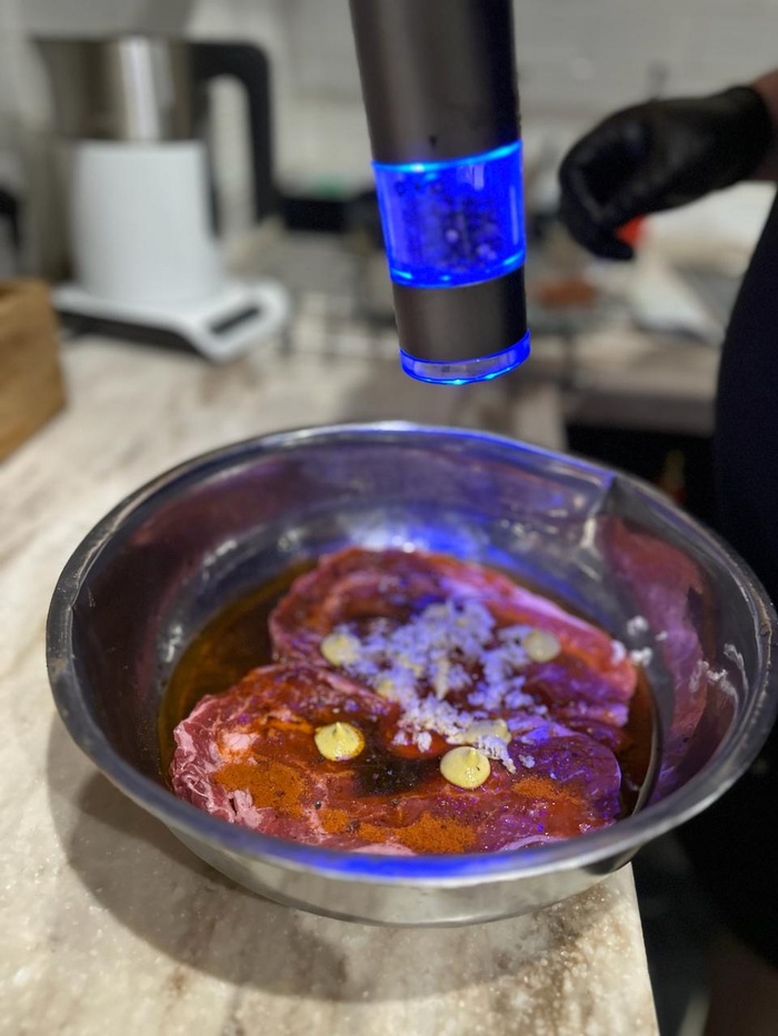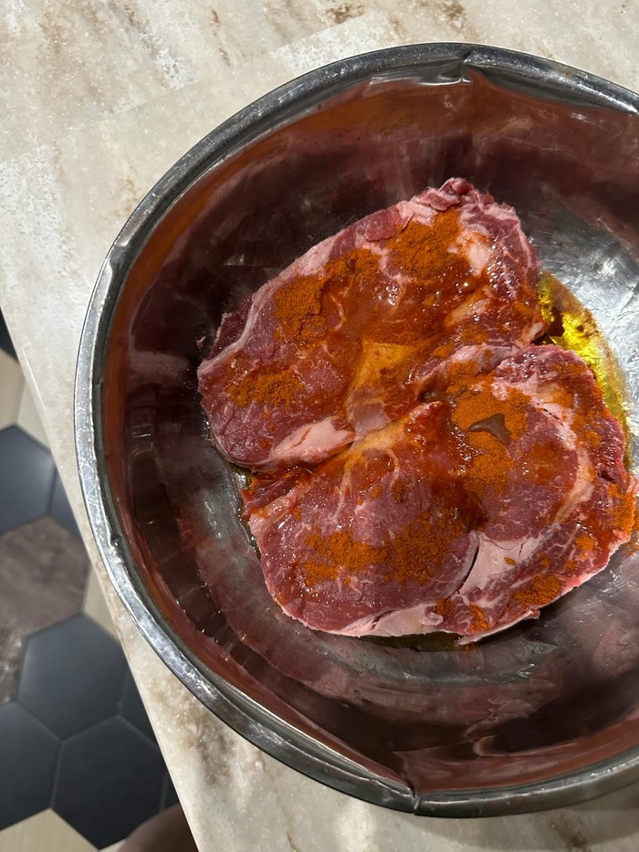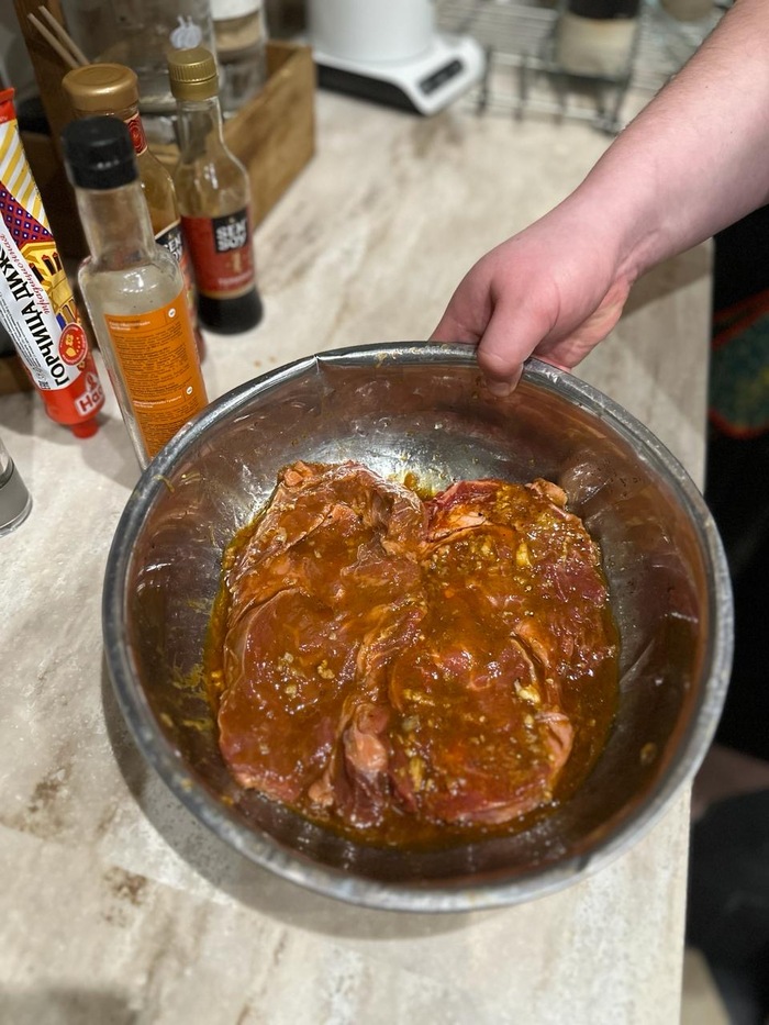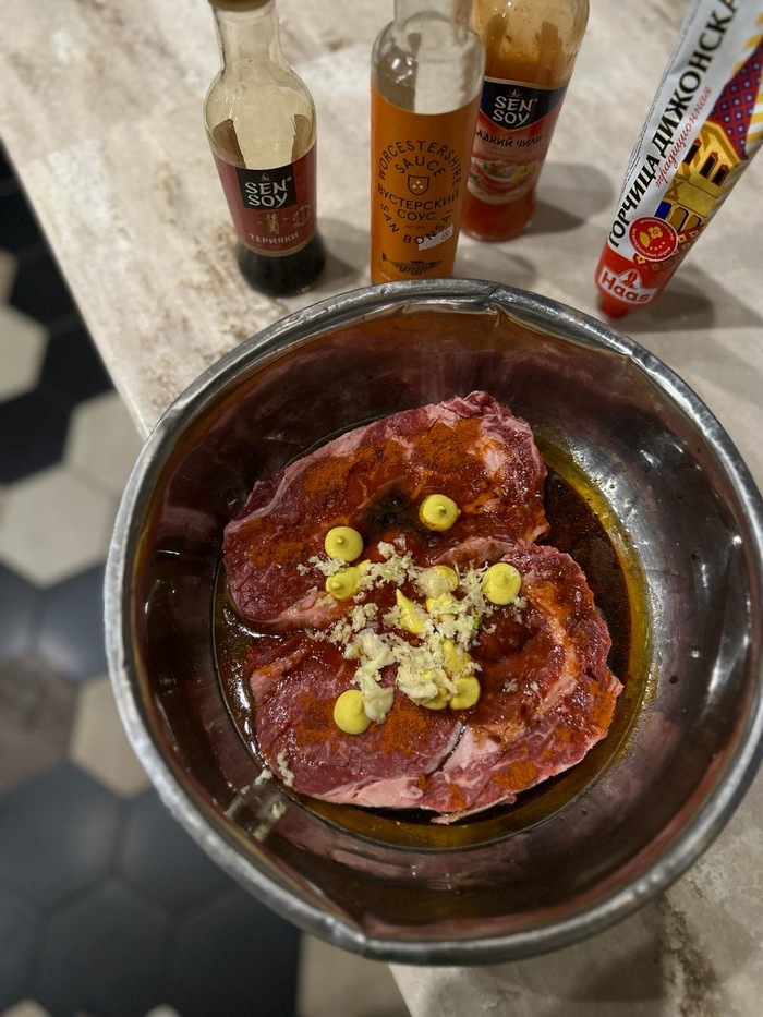Подготовьте фланк стейк, обваляв его в смеси специй и настояв в холодильнике не менее трех часов. Достаньте его за полчаса до приготовления.
