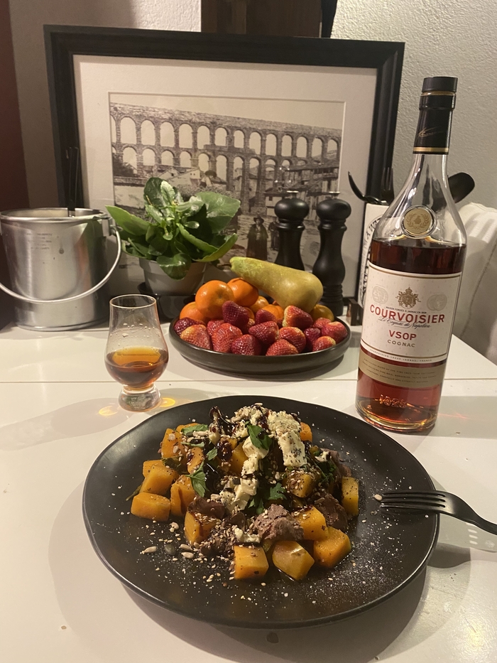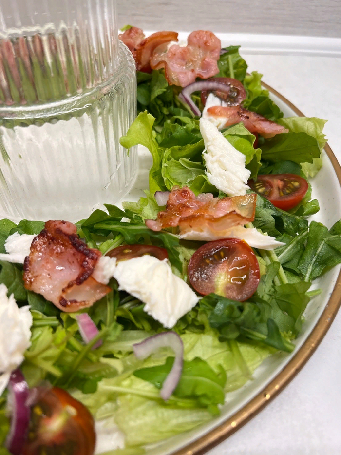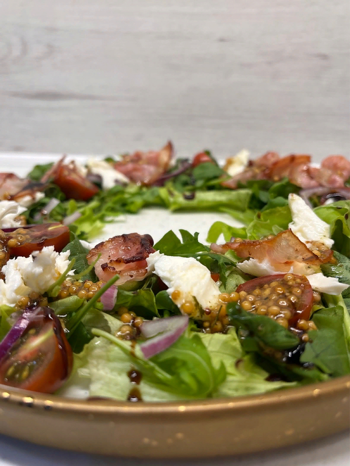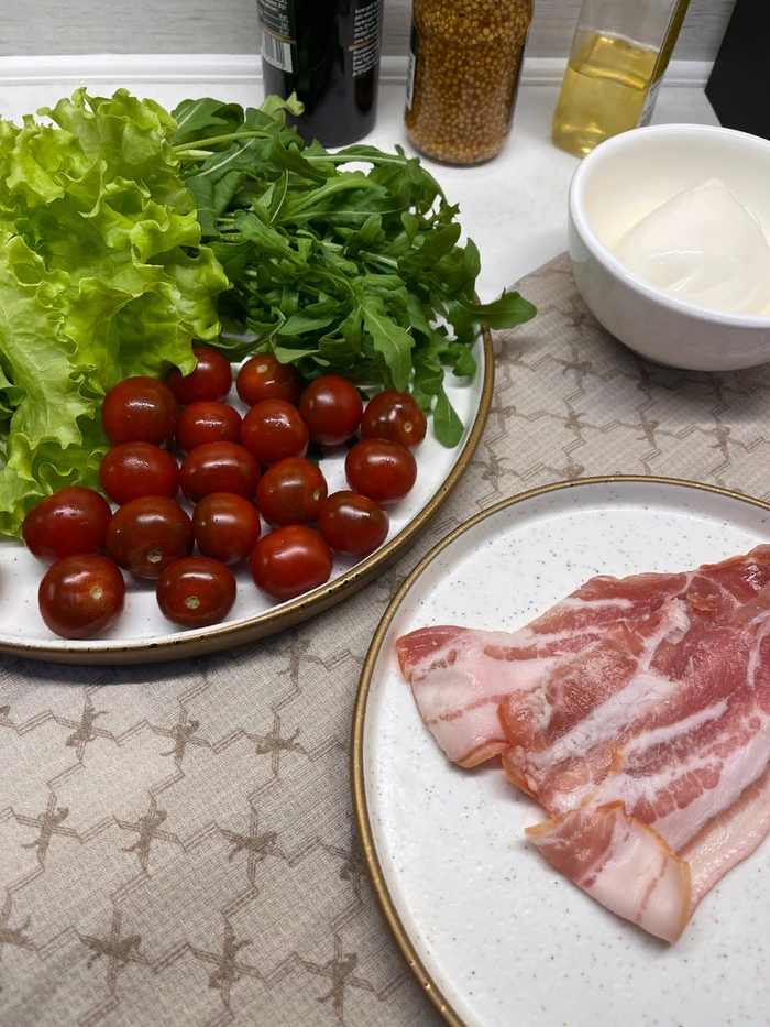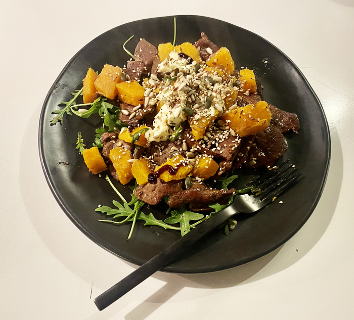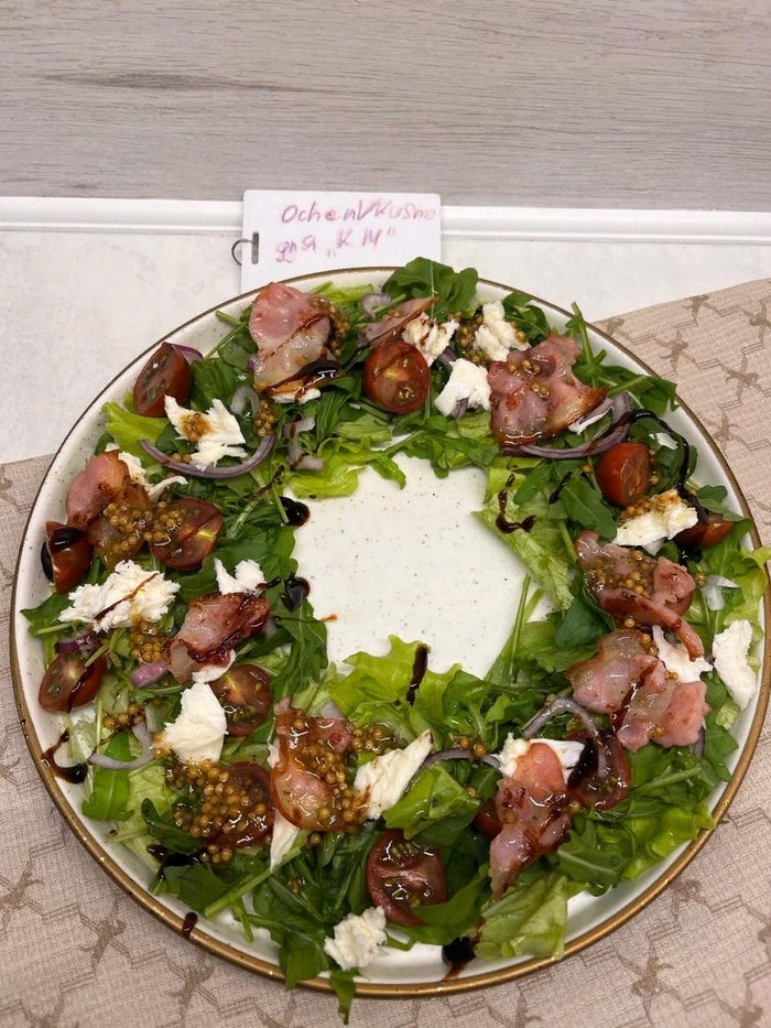 Стейк в сухом маринаде, обжаренный на гриле; салат из капусты кейл с беконом, клюквой и грецкими орехами; сладко-острый майонезный соус и вкуснейший швейцарский сыр.
