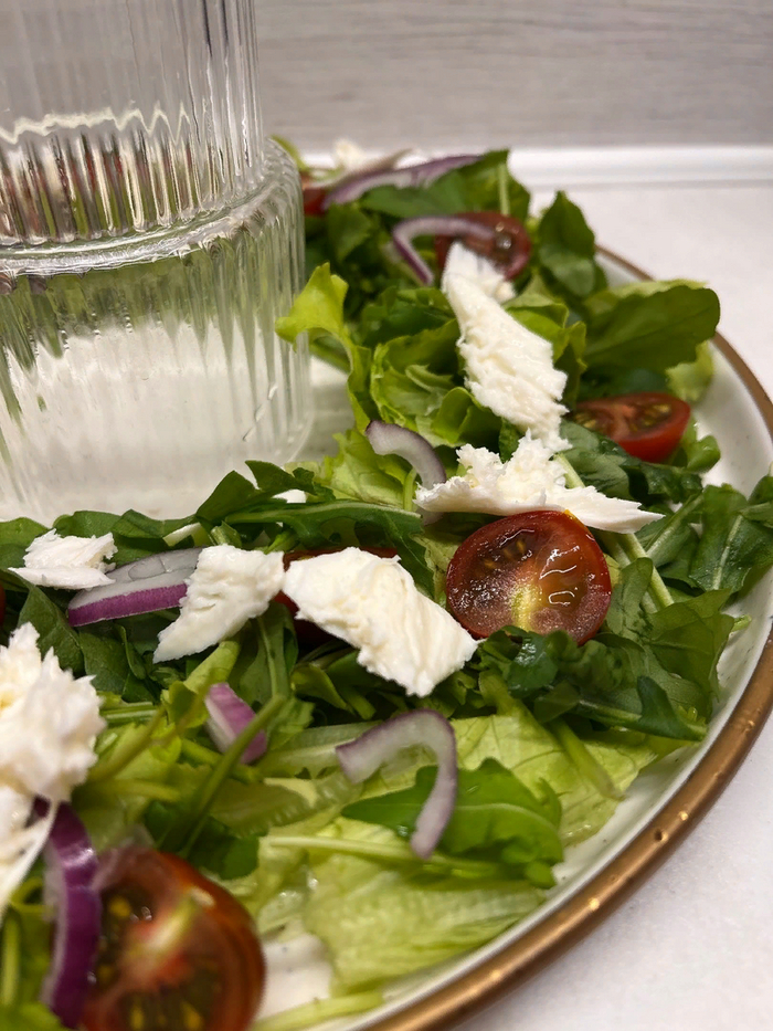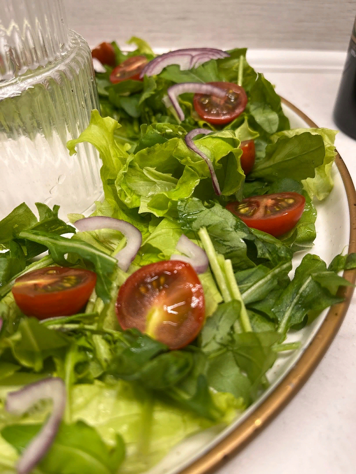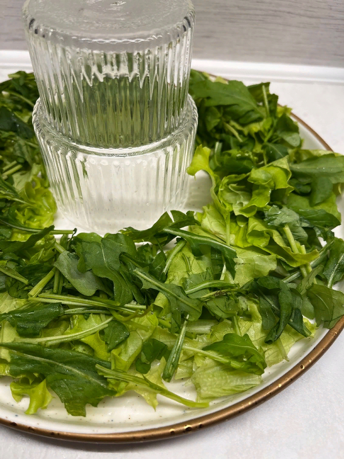 Для капустного салата порежьте мелко кейл и рукколу, добавьте сушеную клюкву и заправку.