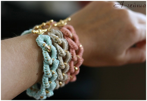 Очень классная и красивая идея - связать браслет на толстой цепи. Мне очень понравилось. Здесь главное выбрать достаточно толстую цепь и тонкую нить с крючком. Схемы нет, поскольку тут просто нужно обвязать звенья и пристегнуть застежку.