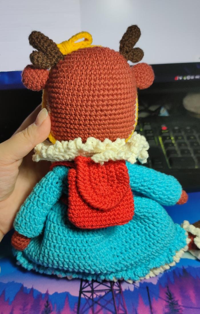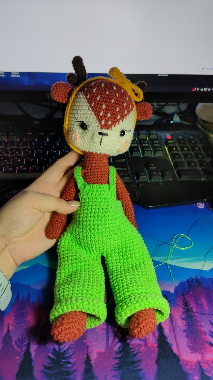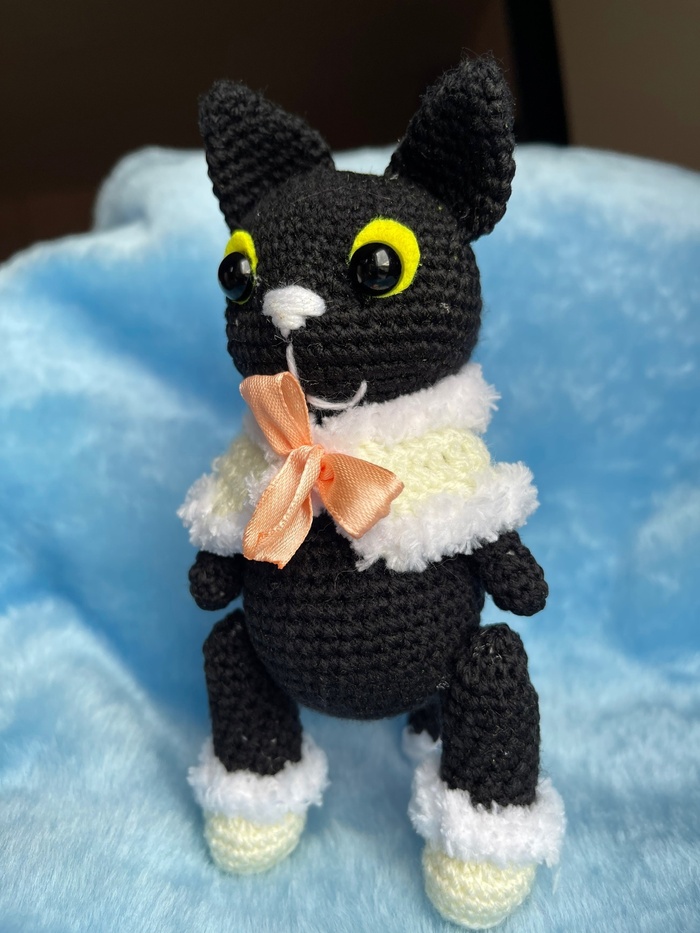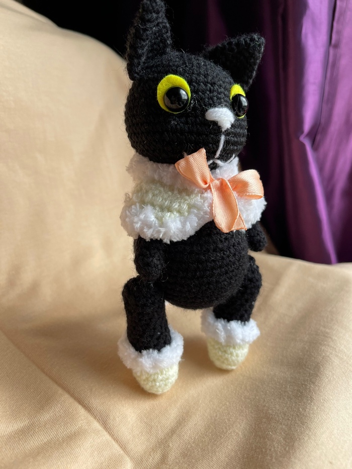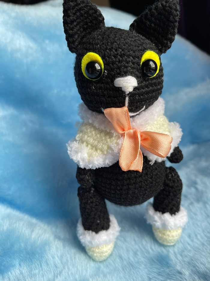 В ленту представляю вам вязаную элегантную кошечку. Несмотря на то, что я не особо люблю использовать пушистую пряжу, так как она плохо отображает узоры, необходимые для создания деталей, я смогла легко связать накидку и ножки этой прекрасной игрушки. Высота кошечки составляет 16 сантиметров, а глаза выделяются своим ярким желтым цветом.