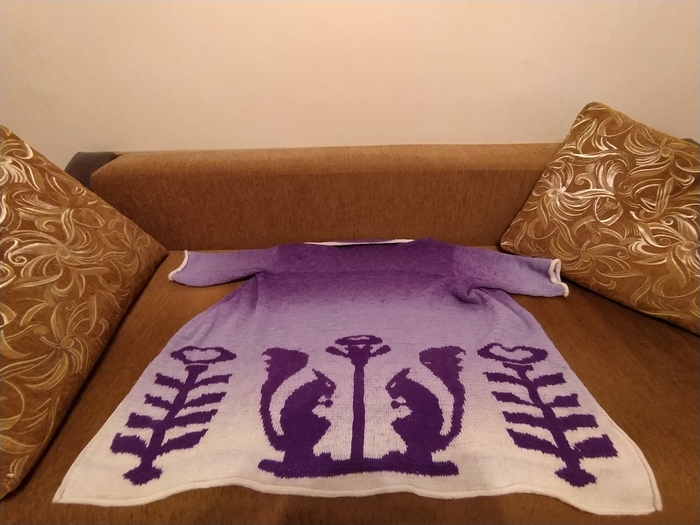 Пряжа "омбре", в каждом мотке плавный переход от белой к темно-сиреневой, очень рыхлая и мягкая шерсть, мнется, но зато легкая и теплая. Нарочно вязала "в обтяг", предвидя, что после нескольких стирок растянется, несмотря на влажно-тепловую обработку, так и вышло. Орнамент вывязывала жаккардом, беря темную нить из конца мотка. До пройм вязала жакардом одним полотном. Отделка руликом светлой нитью. Рукава "три четверти".