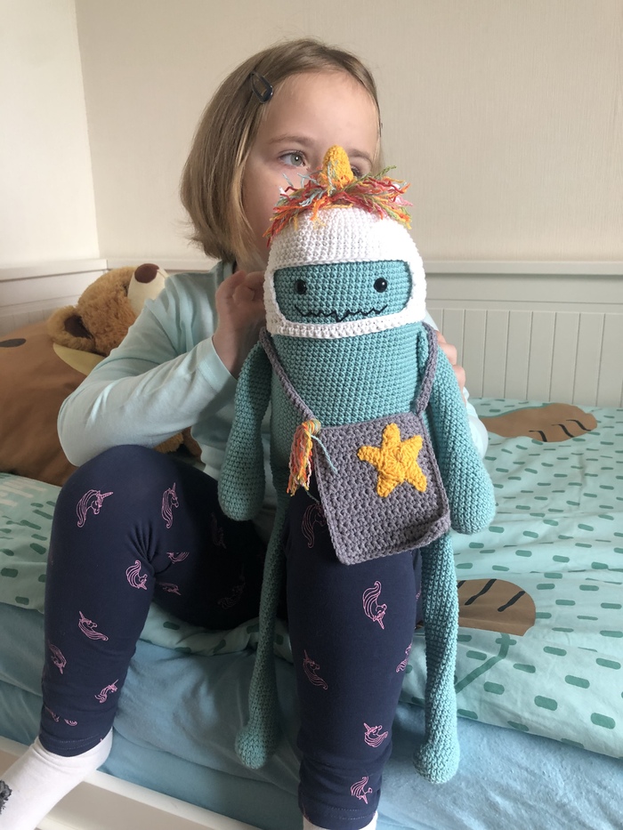 Зайка связан по МК @kuzma_valya, голова поворачивается, ручки и ножки двигаются, высота 29 см. Когда сын увидел зайку, он сказал, что похож на зайку Шнуфель. Я не полянилась и посмотрела, кто такой Шнуфель. И действительно что то есть схожее.