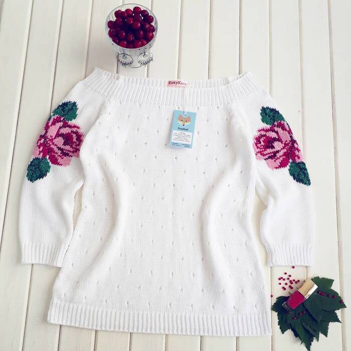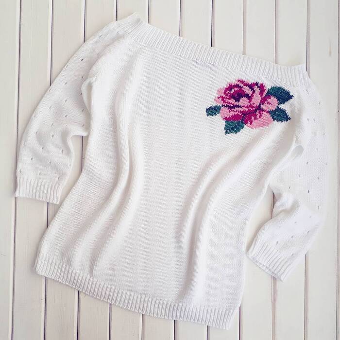 Розы на одежде завоевали миллионы сердец девушек по всей планете. И я не смогла обойти такую вышивку стороной. Всё-таки роза - королевский цветок! И в сочетании с белым хлопком, она произвела эффект цветной бомбы) Перед и спинка с перфорацией, приятно пропускают ветерок.