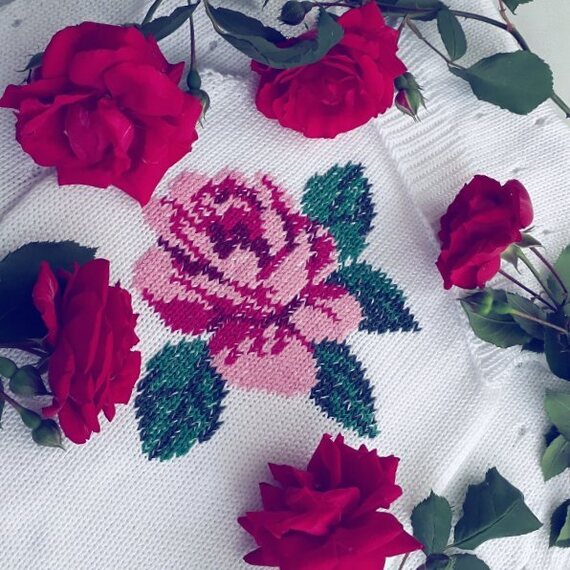 Розы вышиты вручную, выдержали стирку на 30 градусах и не полиняли.