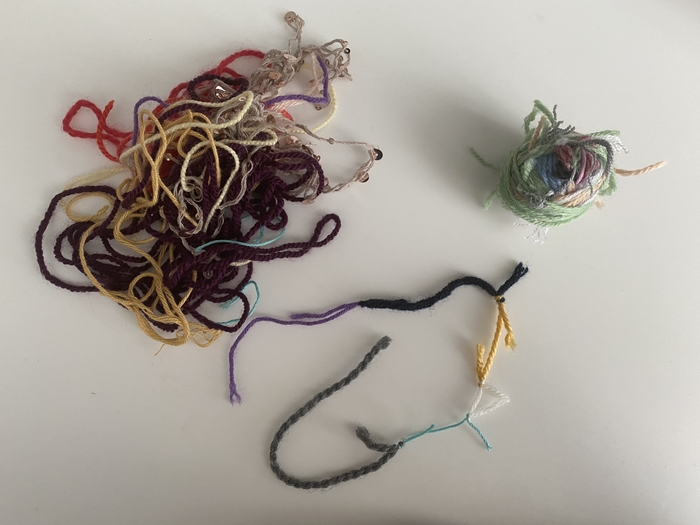 Объектом исследования послужили хваостики, куски, маленькие мотки, остатки пряжи. Любой диаметр, состав, цвет и длина. Длина - от 3-5 см до метра или более. Те что особенно длинные не вызывают проблем их можно вывязывать полосами, из них можно вышивть узоры, но и они за собой оствляют хвосты! Поэтому возвращаемсч к актуальности.