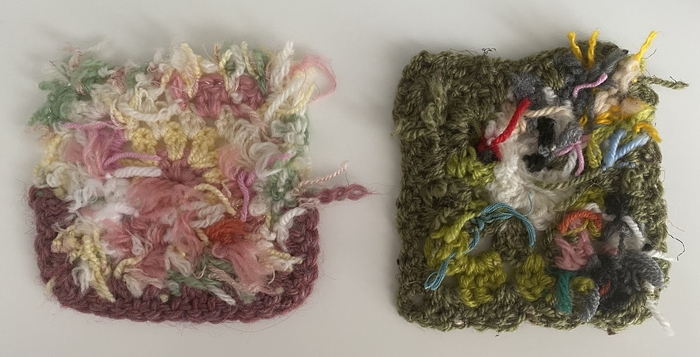 Перед началом работы в нитки можно рассортировтать по длине и тогда «пряжа»выполненная из более длинных нитей будет вывязывать болоее однородные участки, а связанные квадраты будут менее пестрые. Можно рассортировать по цвету и собрать однотонную «пряжу». Можно связать из хвостиков одного изделия, в данном случае каждый квадрат будет напоминать о проделанной работе)))