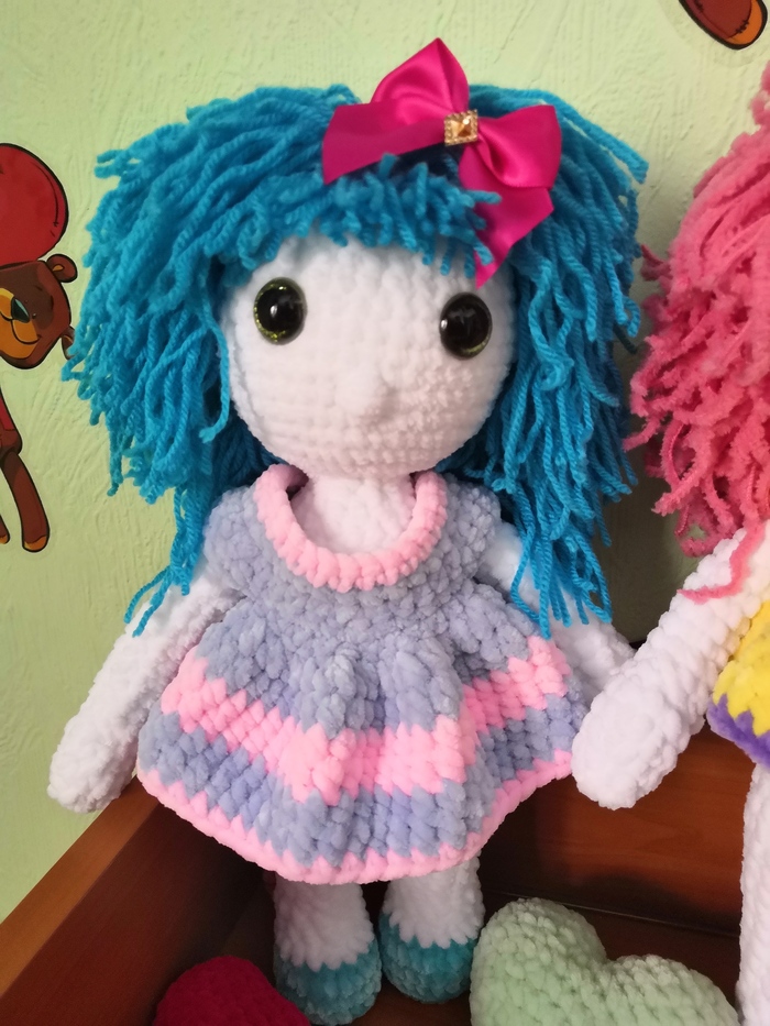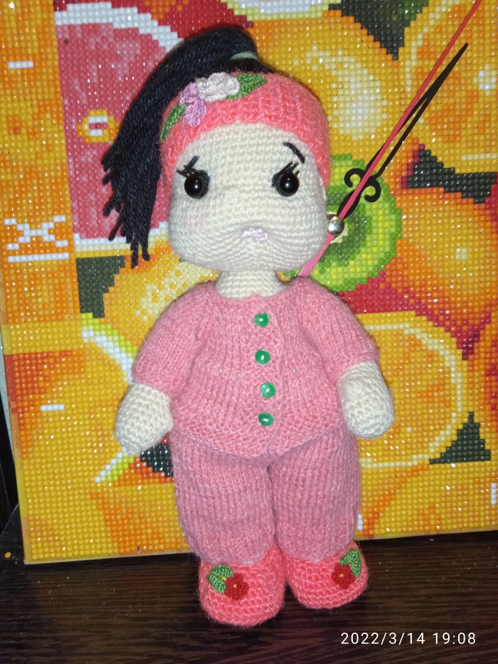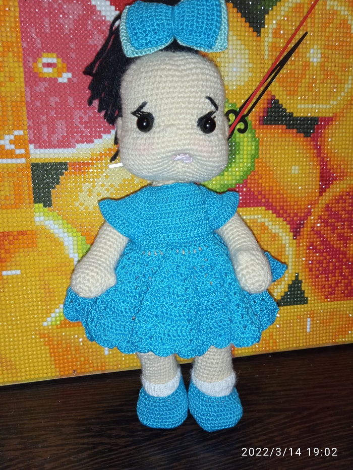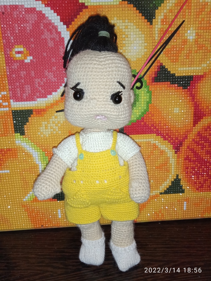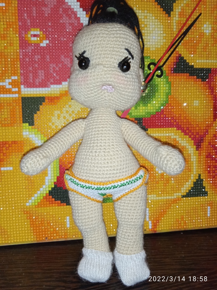 Однажды вечером захотелось связать мне пупса, да такого, чтобы фигурный был. Сказано - сделано. Схема найдена, нитки подобраны, другие материалы под рукой... Пять часов без сна - и вот родилась она. Из плюсов: черновласая, черноглазая, щекастая, попастая, 20 см ростом. Руки и ноги в процессе изготовления ввязывались, а не пришивные. Также имеется богатый внутренний мир - проволочный каркас, ну и куча холлофайбера. Из минусов - стоять может только в обуви и в определенной позе, иначе перевешивает либо голова, либо попа.