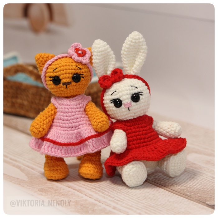 Зверята получились у меня миниатюрные - примерно 9 см, а зайка из-за ушек чуть повыше.