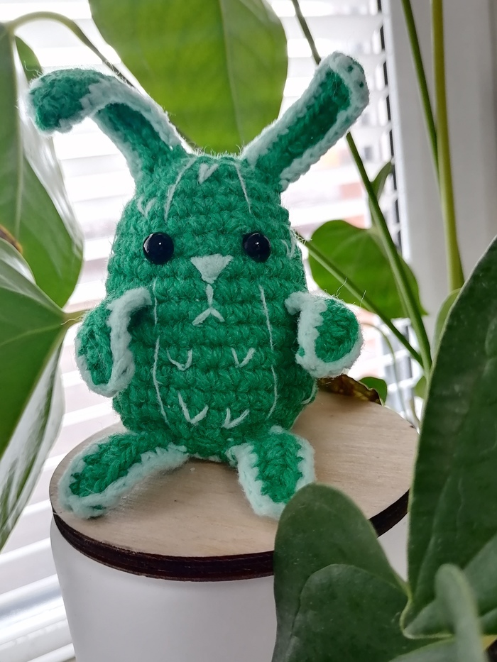 Связан из пряжи Пехорка Нежная и Летняя, ушло темно зелёной чуть больше одного мотка. Наполнитель синтепон. Проволочный каркас и утяжелитель в виде камушка. Мастер класс простой и подробный в свободном доступе в интернете.