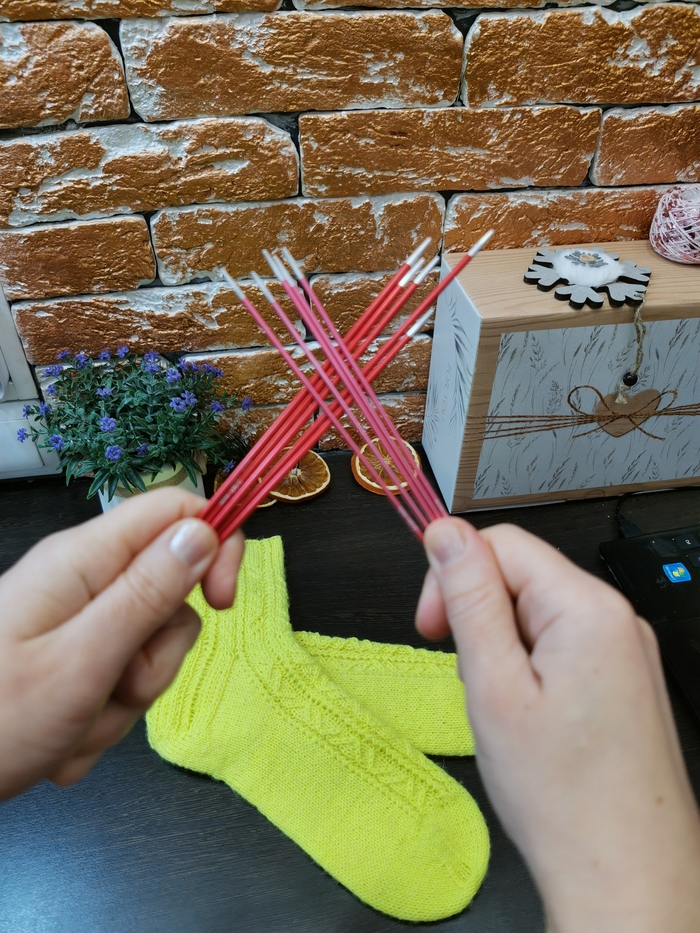 Я вяжу носки чаще всего чулочными спицами. На эти носки набирала 60 пет