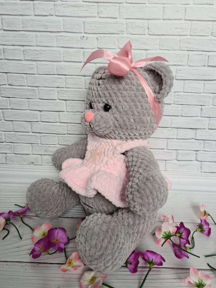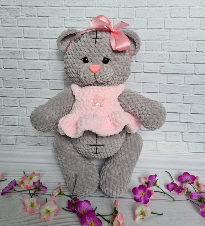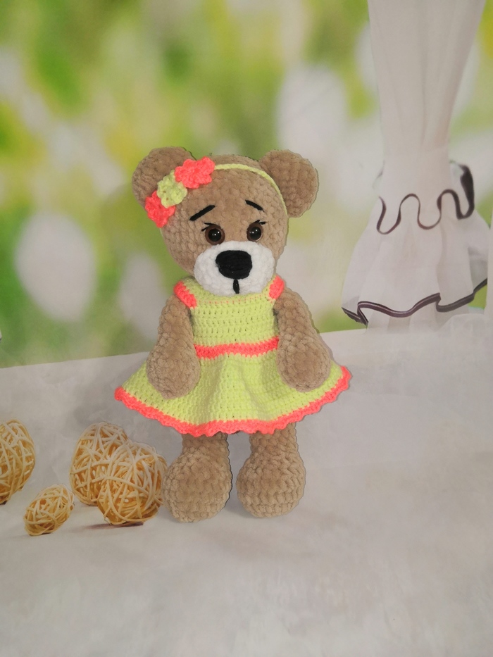 Мишка Теддичка вязала для пробы, понравилась очень, решила что мишкам Тедди быть ))). Платье сделала стемное, сзади на пуговках. Ножки подвижные, стараюсь у всех игрушек так делать, так удобнее управлять игрушкой😁.