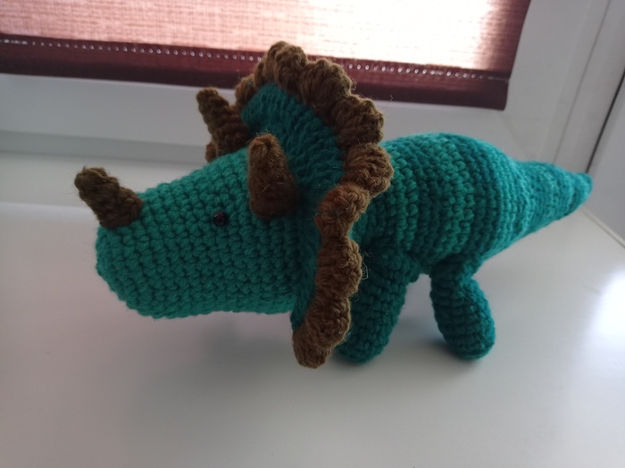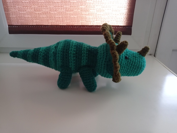 Трицератопс.пряжа Пехорка народная, цвет светлый и темный изумруд - для головы, тела и хвоста, для рогов и гребня - остатки пряжи - темного зеленого цвета,крючок 2,5. Наполнитель синтепух.
