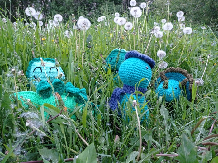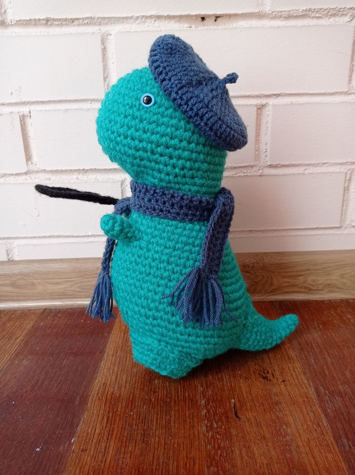 Тираннозавр и трицератопс для приза за лучший вопрос. Схемы взяты из интернета, пряжа Пехорка народная, цвет светлый изумруд, крючок 2,5. Берет, шарфик и лупа тираннозавра, связаны из остатков пряжи, к сожалению не помню какой. Наполнитель синтепух.