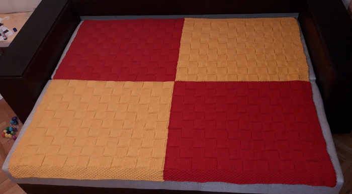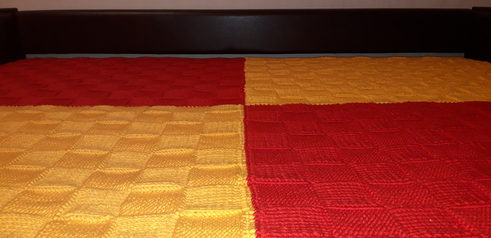 Задача ясна, закупаю пряжу и приступаю к работе. Поскольку полотно довольно большое, решено вязать 4 квадрата и затем их соединить. Размер пледа 170×190 см, полушерстяная пряжа - и тепло, и не колется, узор двусторонний, то есть плед выглядит одинаково с обеих сторон, вес - 2,6 кг.