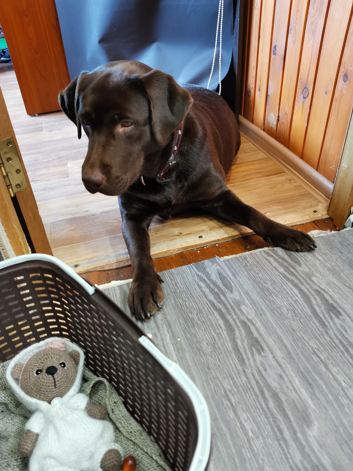 А Мэри у нас очень любопытная собака, заглядывает кто это там такой в корзиночке лежит.