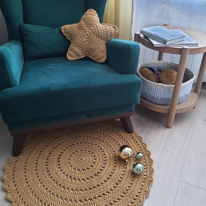 Началось всё с того, что дико мне захотелось освоить вязание крючком. Спицами еще как-то что-то могла, а вот на крючок никогда терпения не хватало (возможно, потому что первой работой лет в 13-14 я запланировала связать огромный солнечный зонт? да неее... быть не может). И вот, спустя очень много лет, крючок ворвался в мою жисть)) Связав игрушку ребенку по схеме, поняла, что уж коврик-то точно смогу, тем более, после ремонта для дальнейшего декора и украшательства семейного гнезда, он - этот самый коврик - был ну просто необходим. Почти как воздух. Поискав информацию в интернете на тему "А из чего вообще вязать эти самые коврики", остановилась на полиэфирном шнуре. Цвет мне нужен был вполне конкретный под мою цветовую гамму, а именно "золото" (горчица бы тоже подошла или какой-нибудь желток яичка деревенской курочки, но такого не было....). Дальше был поиск схемы, а еще лучше видео МК, чтобы прям как для дурачков (а мне только того и надо) было бы расписано, рассказано и показано. МК найден! Схема проста до безобразия: столбики с накидами, арки и снова столбики с накидами.