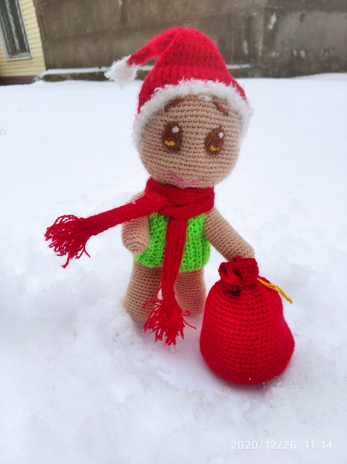 Поскольку Печенька тоже отмечает Новый год (в новогоднем наряде я его точно видела!), то в дополнение к нему и одёжке идёт мешок с подарками. Получив праздничный атрибут, Печенька, уже спустя несколько минут после своего "рождения", твердо стоит на ногах. Вот, побежал на фотосессию вниз, едва увидев снег.😄 И, видимо, собирается в этом году подменить Деда Мороза: он же старенький, на карантине сидит. 😅