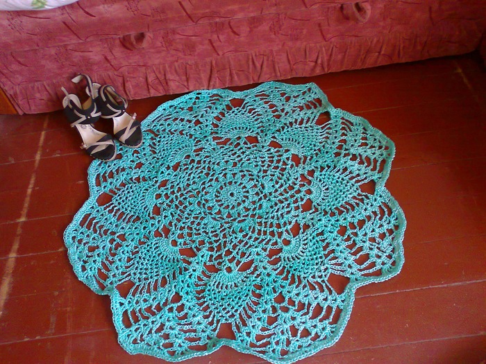 Выбирала понравившуюся схему салфетки и вязала коврик крючком из полипропиленовый ниток (фото из интернета)