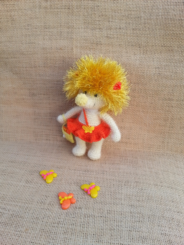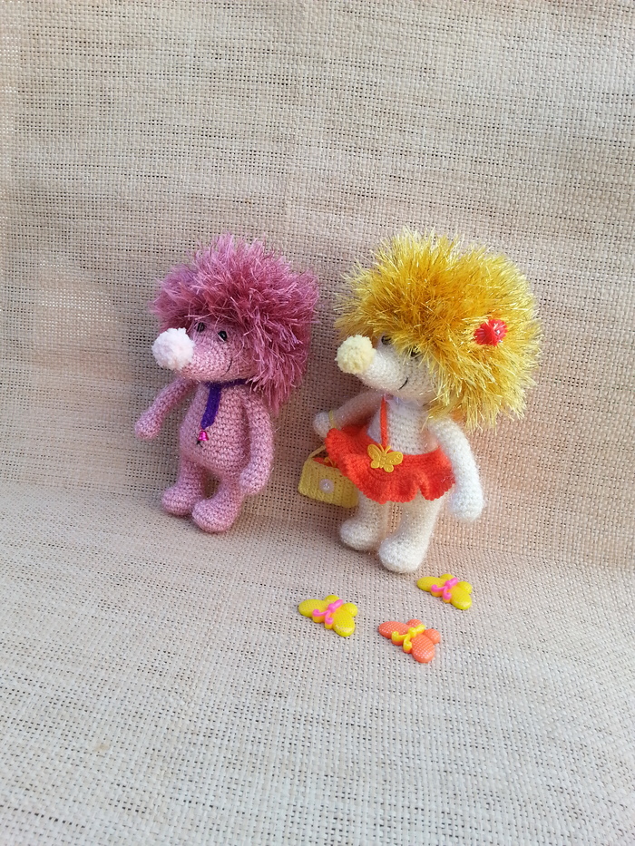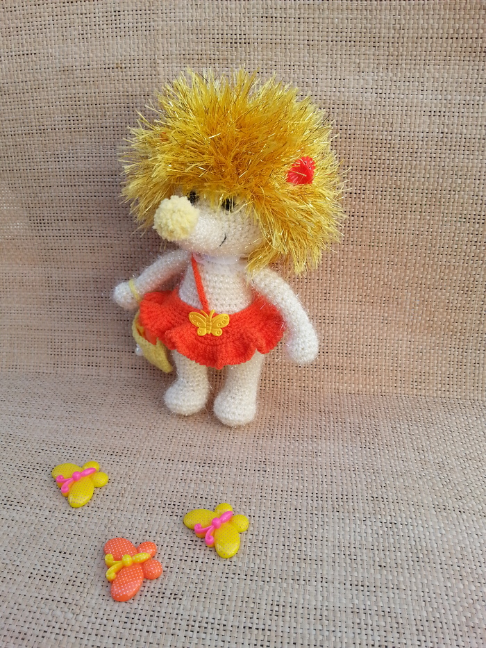 Доброго всем дня! А теперь хочу вам представить девчушку - Ежуньку. Связалась она в пару к мальчику. Связана из акриловой пряжи и пряжи травка, лапки ввязаны в тельце, глазки - бусинки надежно пришиты, юбочка аккуратно снимается. Ежуня умеет стоять с опорой, любит чтобы ее причесывали, совсем не колется. В руках сумочка, которую можно снять и там аксессуар - бабочка. Может стать подарком для ребенка.