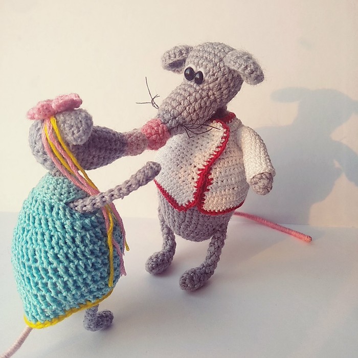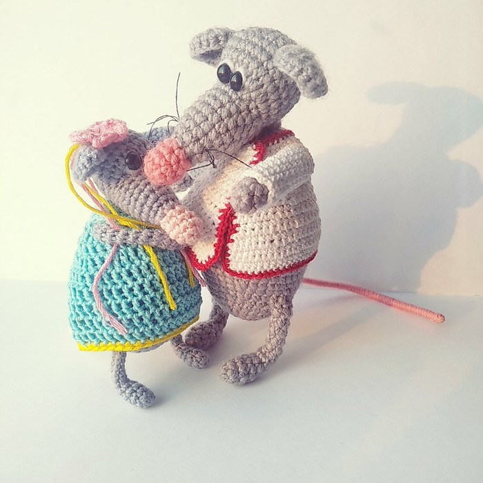 Вязала я этих крысиков по одиночке, вязала... Получилось три одинаковых крысика с одинаковыми грустными глазками. А четвертого мне вдруг стало так жалко, поэтому я связала для него подружку. В эту парочку я вложила всю душу, всю тоску по любимому человеку, загадав, что, если у меня получится то, что задумала, то и у нас с ним всё будет хорошо. Связала их, оформила выражение мордочки каждому... И расплакалась, так они напомнили мне нас с моим молодым человеком. Ну, поныла и хватит, вот смотрите, что получилось