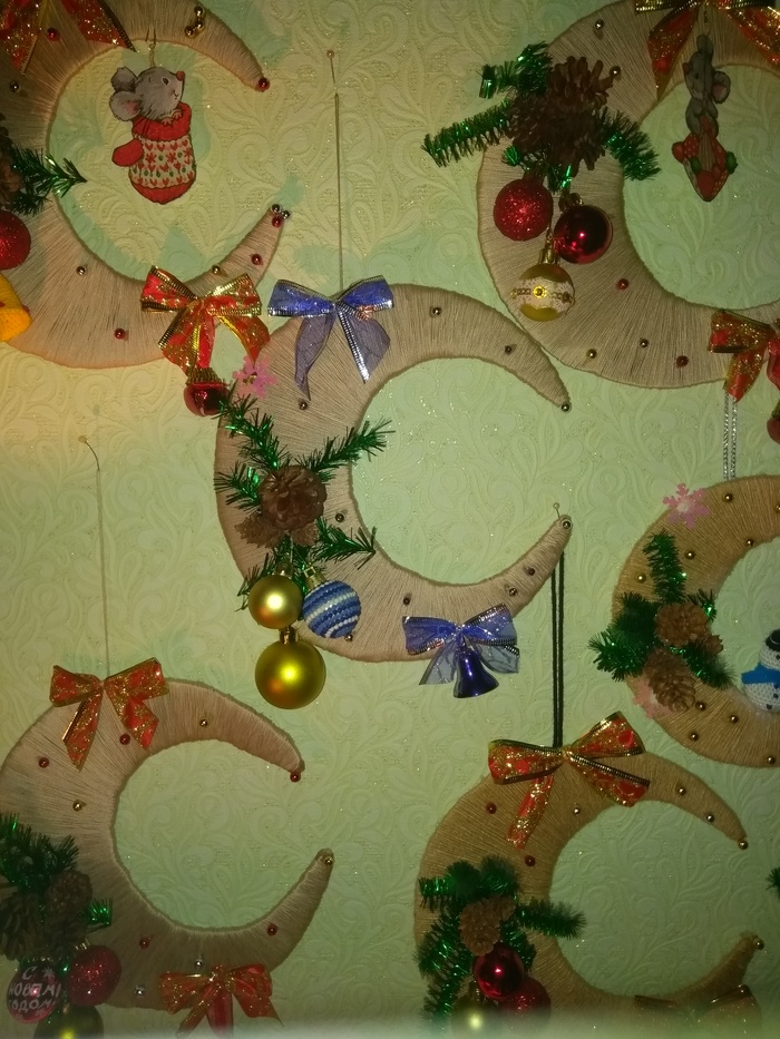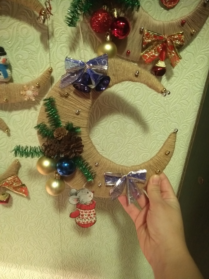 С тихим ужасом понимая, что при плюсовой погоде и отсутствии снега новогоднее настроение не появляется не только у меня, а появляется депрессняк... я вдруг решила (и кто ж знал, что на денёк засяду?! ) , что вязаными снеговиками да мышами я фиг отделаюсь. Вязать их долго, мадам Фантазии нынче без зимы жить тяжело, а потому, видимо, мозг требует отдыха! Ну и отдохнула... В итоге висят, ждут упаковки, восемь месяцев и стоит одна ёлка. Настольная (эта зараза потяжелее будет всех вместе взятых месяцев, зато она деревянная). Собрано это дело на коленке, из подручных материалов (пучка нервов, шила в попе, и ещё какой-то матери, ибо вдруг оказалось, что зелёная мишура имеет свойство кончаться в самый неподходящий момент и найти ее в нашей деревне - это ещё надо уметь), но народу нравится, значит, день лентяя я отпраздновала хорошо. )))