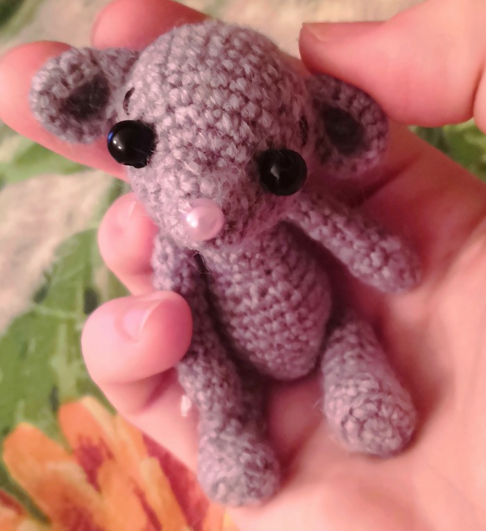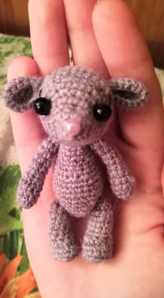 Все время умилялась маленьким вязаным игрушкам. А это попалась схема мышонка от @VikGoldFish, и я не удержалась. Связала мышонка ростом 8 см. Ножки и ручки сгибаются, умеет сидеть.