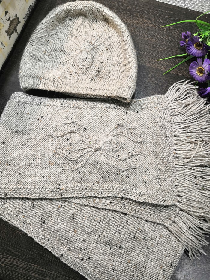 А дальше сплошные пауки... Свитер показала выше... Теперь шапочки и шарф.. Я уже без схемы могу их шпарить, хоть среди ночи разбуди 🙈