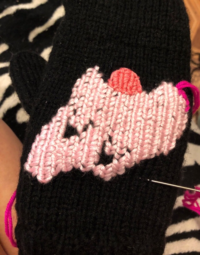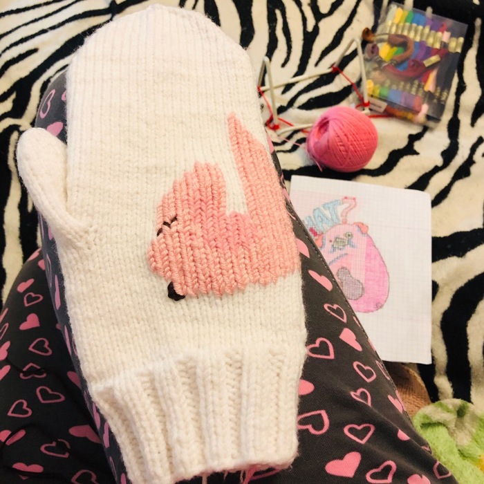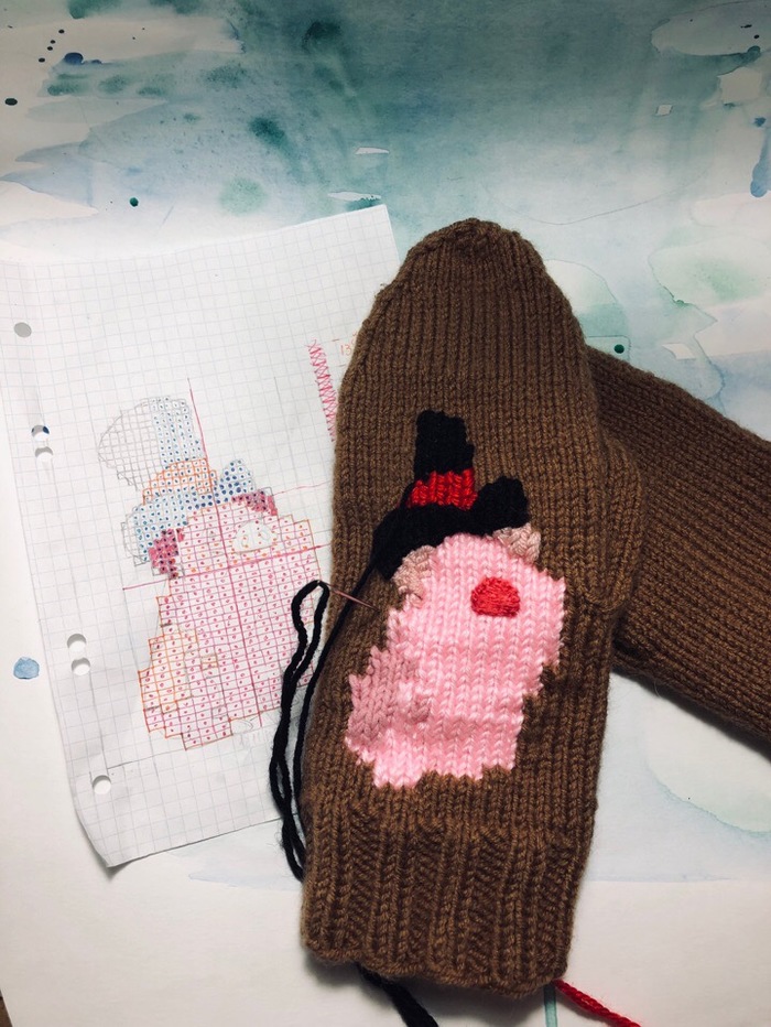При вышивании варежек с Пухлей (на фото) я выбрала нити большего диаметра, и одна варежка получилась чуть шире, чем варежка без рисунка.