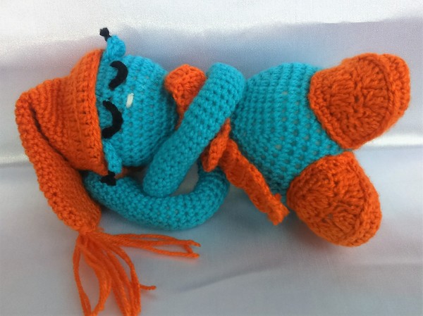 Малыш полностью связан из хлопковой пряжи. В ножках и тельце использован каркас. Глазки пластиковые. Рост с хвостиком 145мм.