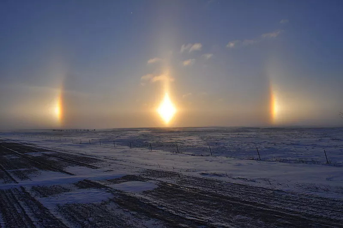 Солнечными собаками это явление прозвали в народе. А в науке ему есть вполне определенное название — паргелий. Эффект, когда на небе появляется три солнца, на самом деле вполне объясним. Происходит это во влажном морозном воздухе. Когда на улице довольно холодно, микрокапли влаги, находящиеся в атмосфере, замерзают и превращаются в маленькие кристаллы льда.