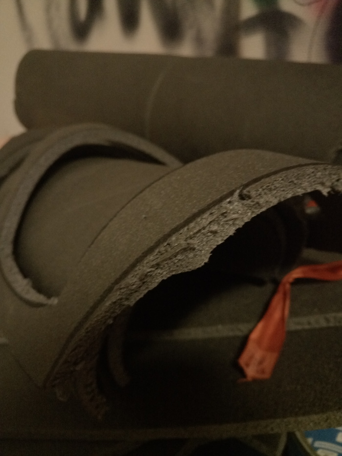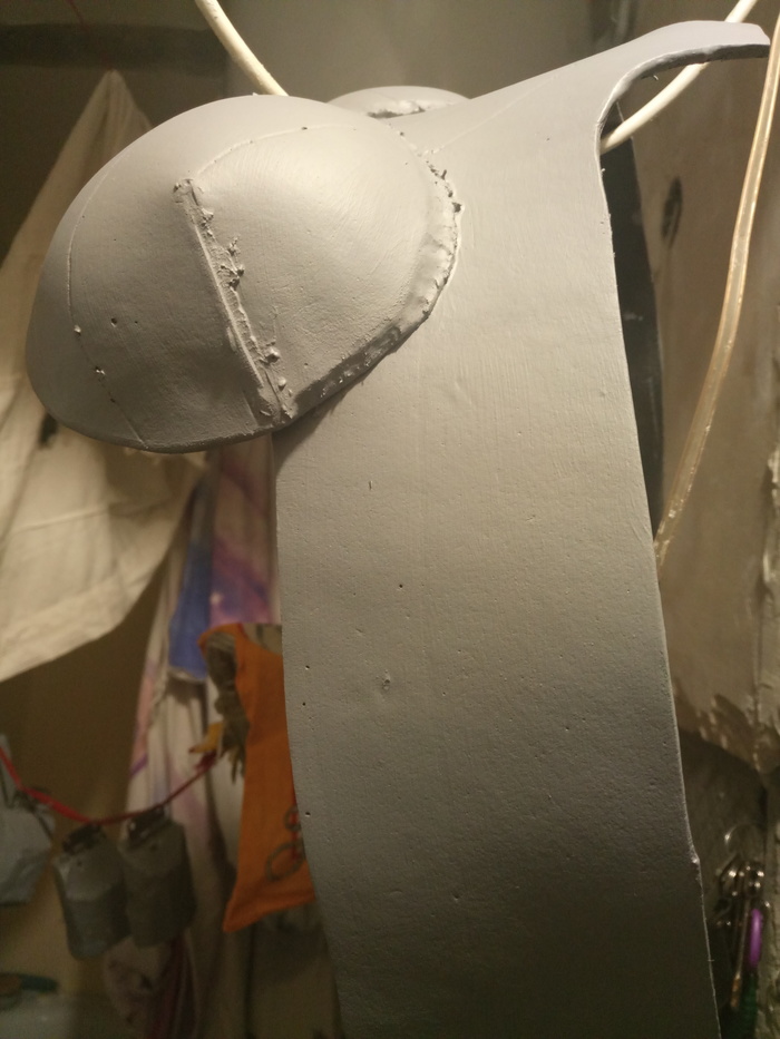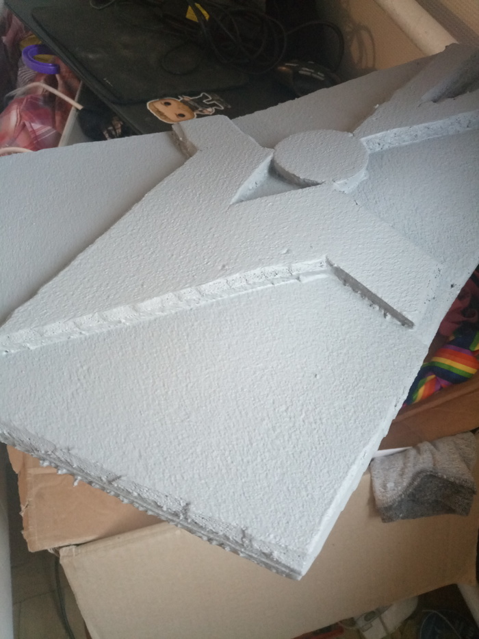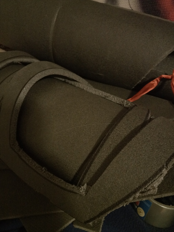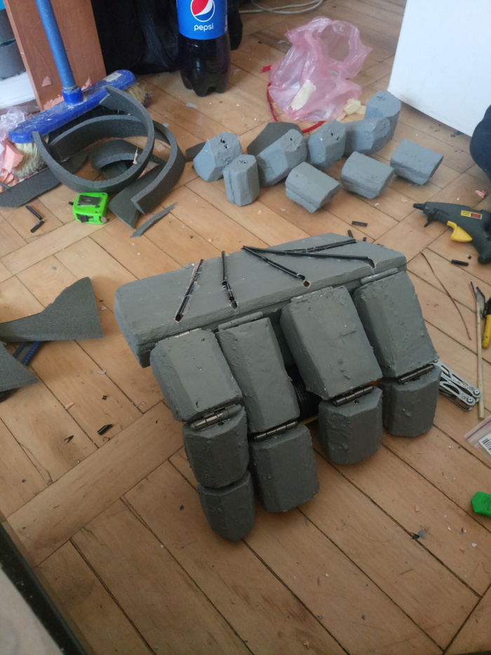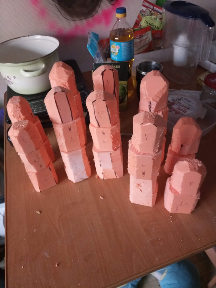 Наплечники было решено фигачить из все того же пенополистерола, склееного эпоксидкой в четыре слоя до формы кубика. Ну и дальше канцелярским ножечком фигурная резьба по пенке. Это было весело, но достало в первые же пол часа.