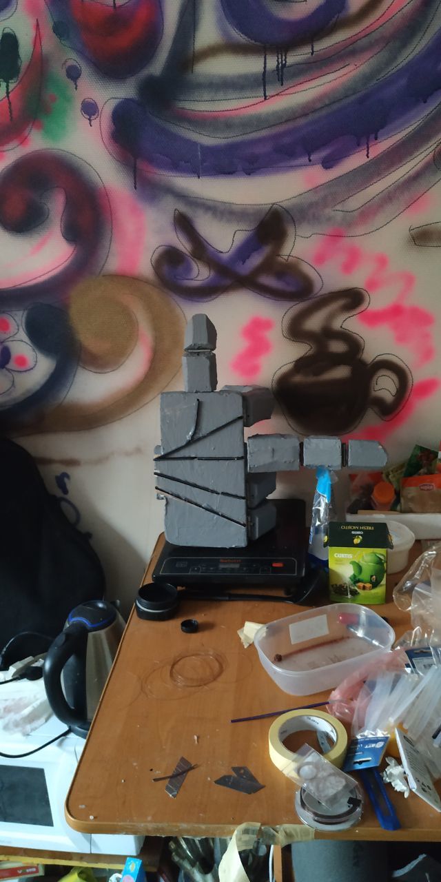 Года эдак три назад я психанула, накупила материала и начала все массово вырезать. Пенополистерол толщиной - на глаз - см пять я склеила между собой эпоксидкой и оставила ночевать под прессом (две баклажки воды). В это же время вырезала детали на руки, бронелиф, нужные отрезки труб. Центральной трубой стала ПВХшка диаметром, если не изменяет память, сантиметров 15. Остальные, более тонкие, пошли на окружающие ее трубки. И потом проект на три года был забыт.