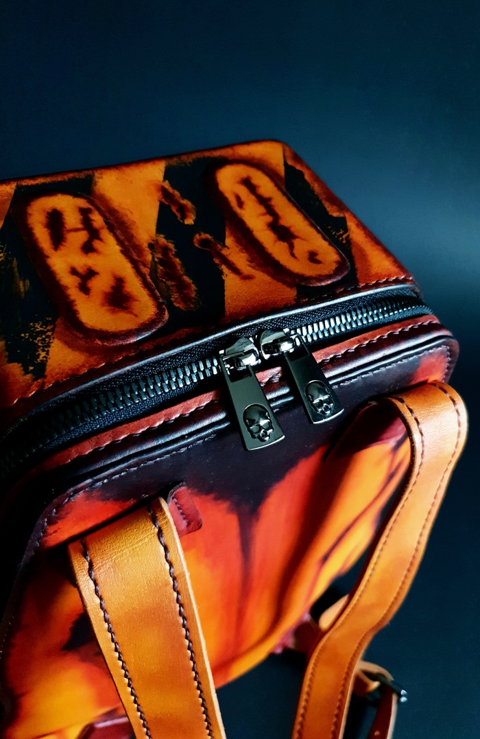 Напомню, рюкзак сделан из кожи растительного дубления в моём любимом стиле. Подклад из овчины. Ручная покраска, кисть, аэрограф. Финиш матовый лак.