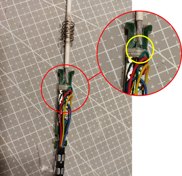 Вот тут видно, где у ручки паяльника расположен и примотан датчик наклона – это максимально возможная дальняя безопасная точка размещения датчика. Он припаивается к контактам: от пружинки - это была земля (корпус), у меня провод чёрного цвета, он идет на управление к Ардуинке. Второй конец - минус общий, в моём случае это синий провод. Датчик – колба со ртутью. При таком расположении внутри паяла, при положении жала вверх (просто положить ручку на стол, жало будет достаточно поднято), ртуть размыкает (или замыкает - не помню) контакт, а Ардуинка это понимает и начинает отсчёт в 5 минут перед отключением нагрева. В случае если ручку перевернуть обратно, то Ардуинка этот таймер отключит.