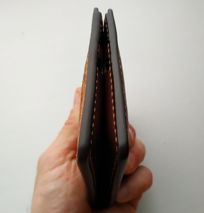 Прилетел с одного сайта с частными объявлениями небольшой заказик. Клиентка захотела вот такой небольшой кошелёк. Кожа КРС с тиснением под кроко растительного дубления. Один отдел под карты и один под мелочь