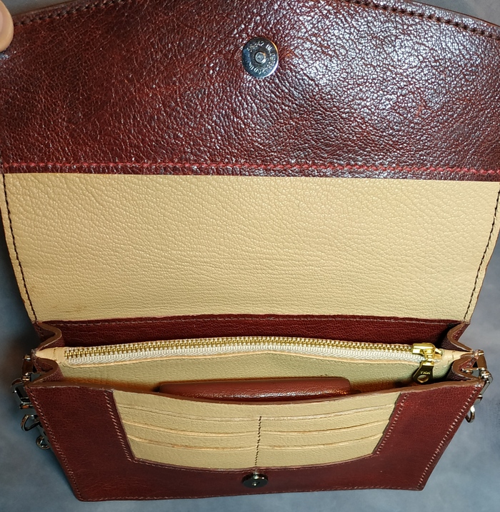 Итак, короткий кошелек с молнией по периметру и цепью кольчужного плетения для крепления к ремню. Внутри одно отделение для купюр 6 кармашков для карт и монетница под одним из блоков карт.